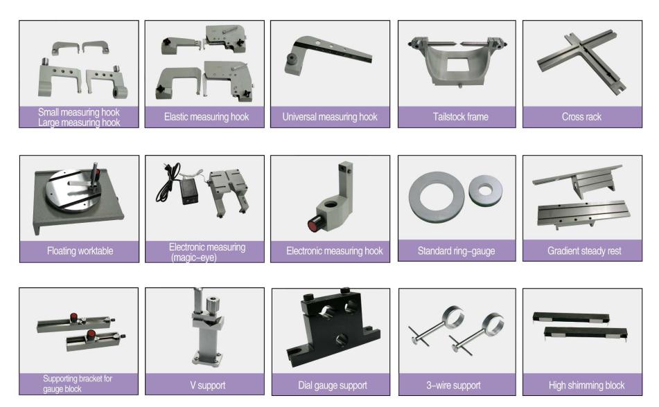 Gancho lateral, Gancho de medición elástico, Gancho de medición universal, Marco central, Soporte transversal, Mesa de trabajo flotante, Dispositivo de medición fotoeléctrico, Gancho de medición fotoeléctrico, Calibre de anillo estándar, Soporte de fijación inclinado, Soporte de escurridor de bloque patrón, Bloque en V simple, Soporte para reloj comparador, Soporte de tres pasadores, Barra espaciadora
